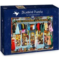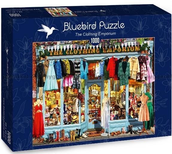 - En butik fylld med kläder från källare till tak. Framför butiken hänger en rad olika jackor och klänningar i klara färger. I fönstren syns skyltdockor iförda eleganta klänningar, och det finns ett överflöd av hattar och accessoarer utställda.