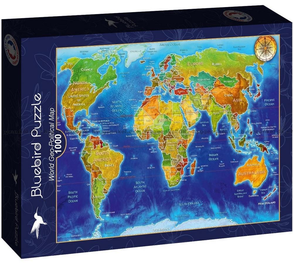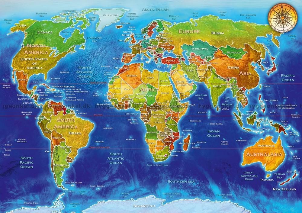 - Ett detaljerat världskarta med färgglada landsgränser och namn. Nordamerika är markerat med gröna nyanser, medan Sydamerika har varma, jordnära färger. Europa är avbildat i gröna och bruna toner