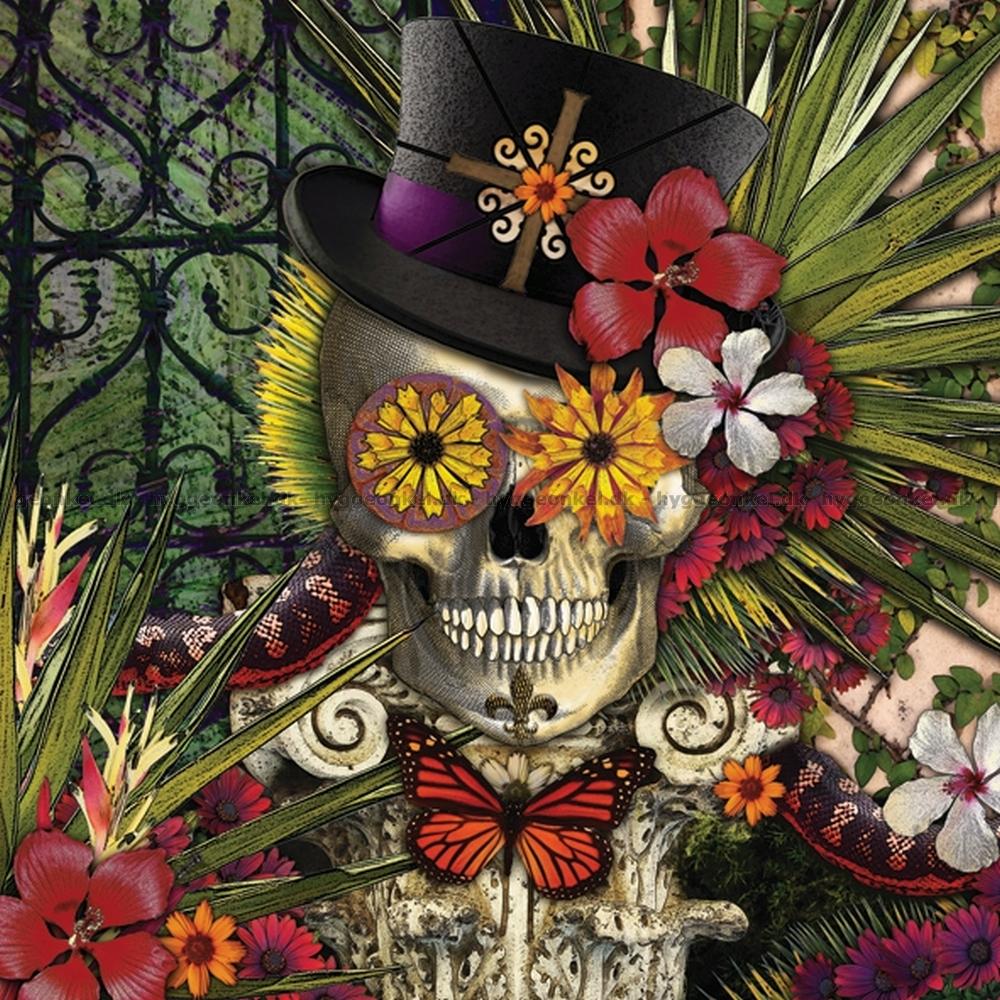 - Skallen är dekorerad med blommor och en fjäril. Skallen bär en svart hatt med lila band och ett dekorativt kors