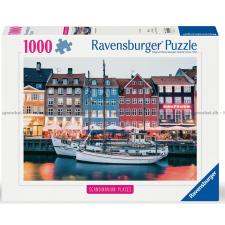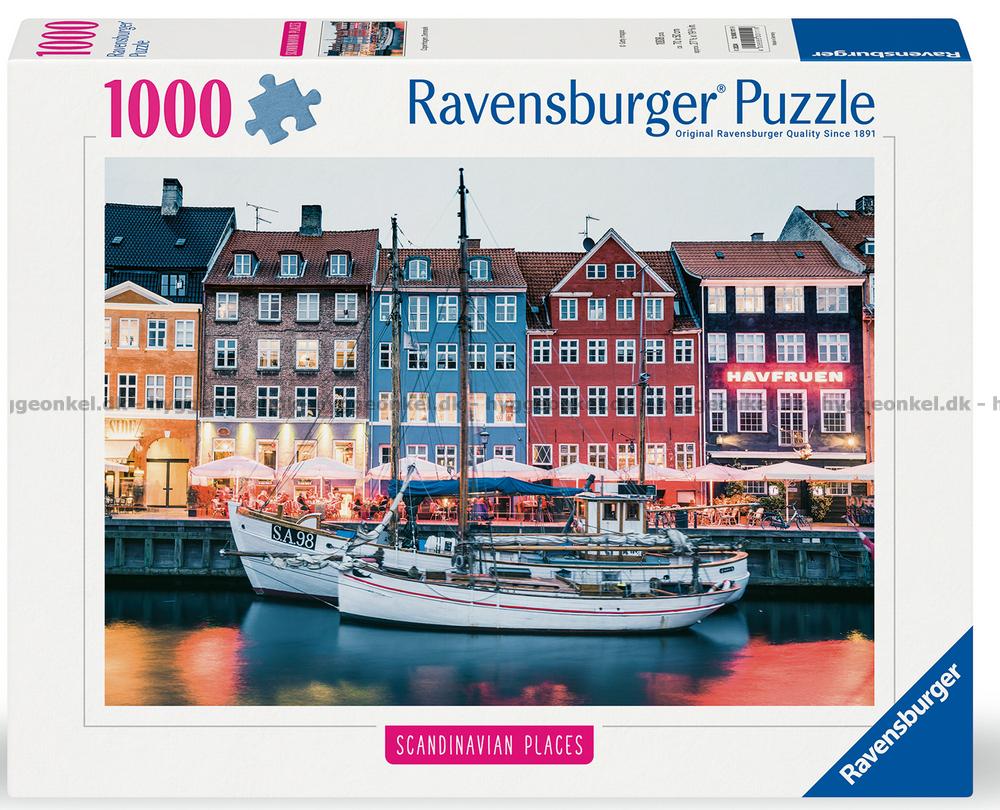 - En stämningsfull kväll vid Nyhavn i kvällsljuset. Längs kajen står en rad charmiga byggnader i olika färger. Framför byggnaderna syns flera utomhuscaféer med vita parasoller, där folk njuter av kvällen