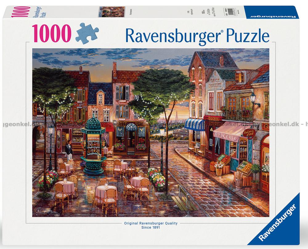 - Motivet visar en charmig parisisk gata i skymningen, där ljuset från gatlyktorna skapar en varm och inbjudande atmosfär. Små cafébord står redo för gäster, medan det ikoniska Eiffeltornet kan ses i bakgrunden.