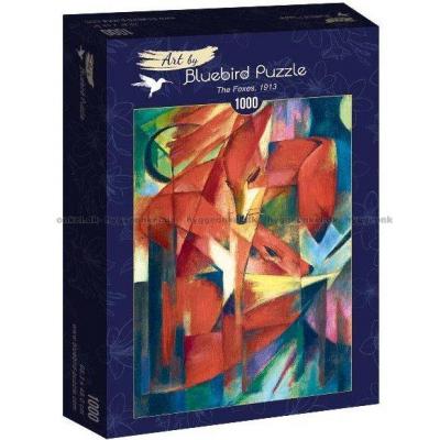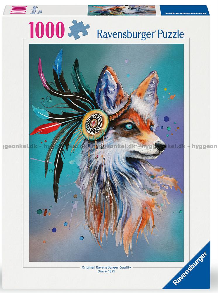 - En majestätisk räv med en färgglad fjäderprydnad syns i mitten av bilden. Dess intensiva blå ögon fångar genast uppmärksamheten.