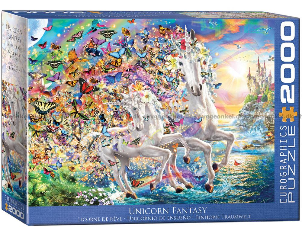 - Två majestätiska enhörningar springer genom ett färgstarkt landskap fyllt med fjärilar och blommor