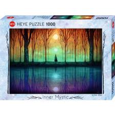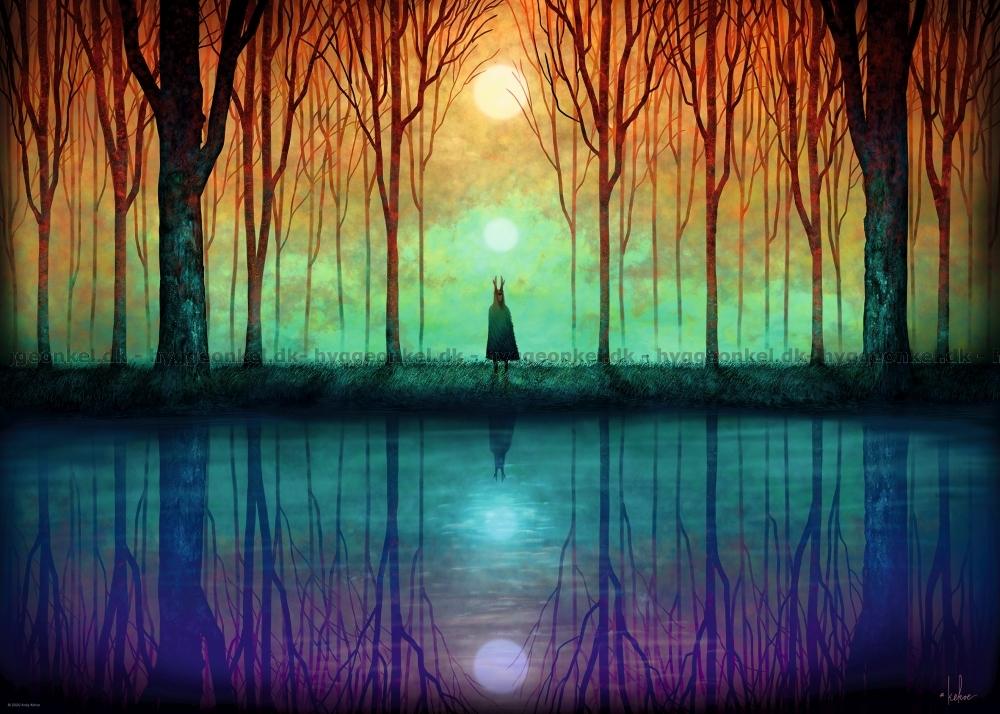 - Mystisk skog med en lugn sjö i förgrunden, där trädens silhuetter speglar sig i vattnet. En gestalt med horn står mitt i skogen och tillför en magisk stämning