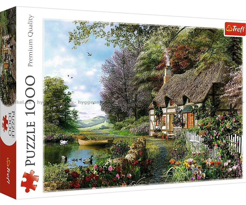 - Det stråtäckta huset omgivet av frodig natur och en stilla sjö. Huset är täckt av klätterrosor och röken stiger stilla upp från skorstenen