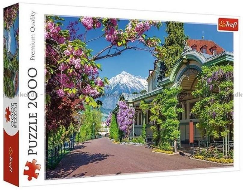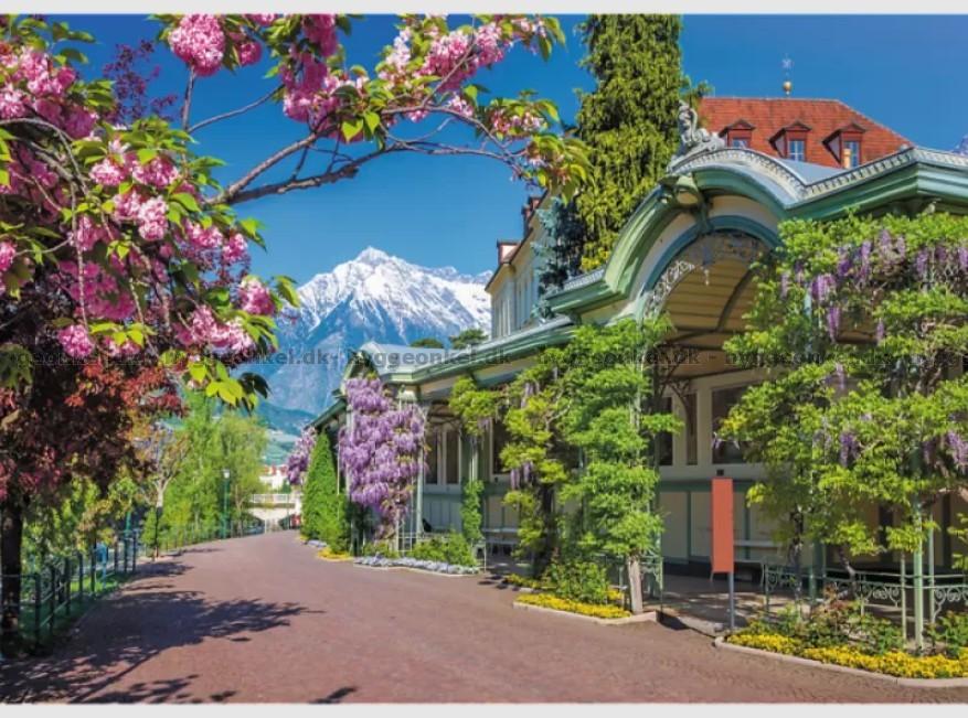 - Träden blommar på den mysiga gatan med utsikt över Dolomiterna