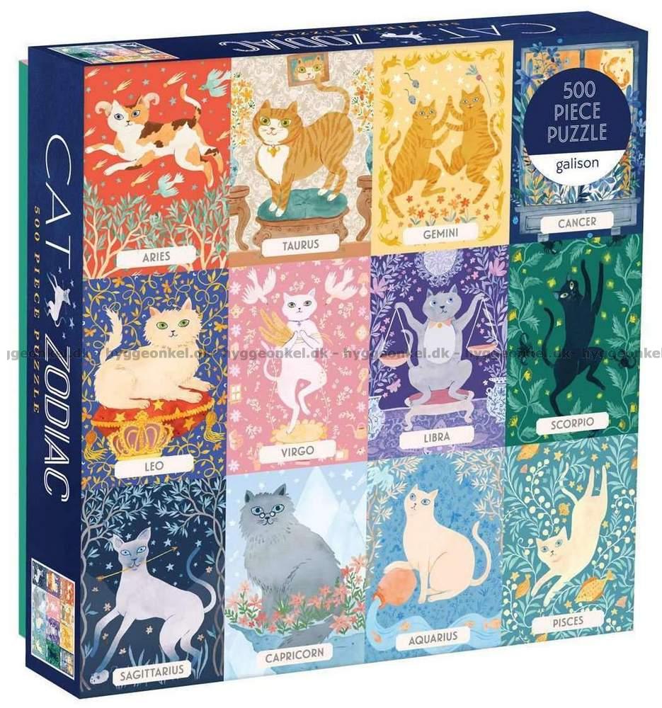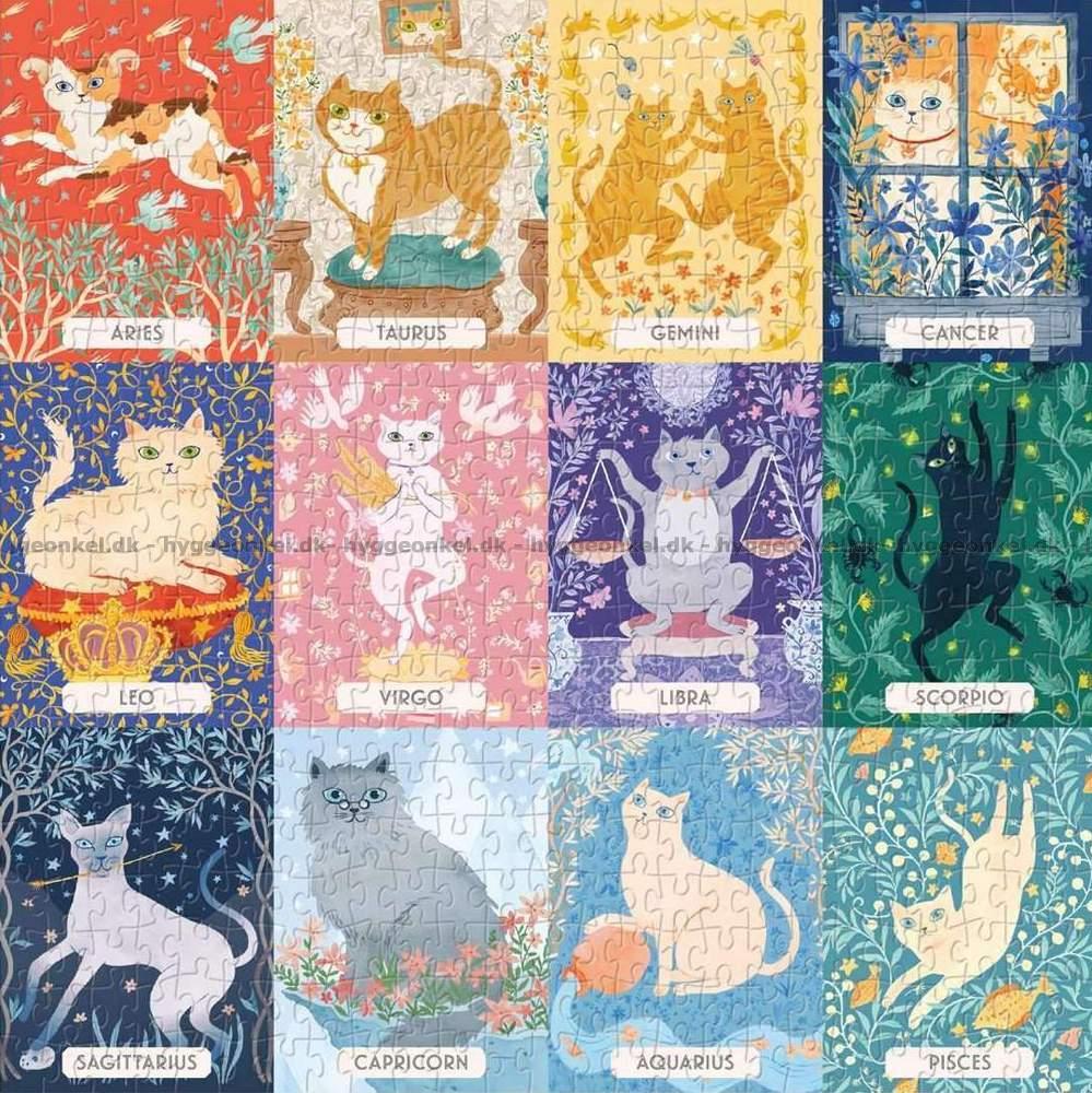 - En samling av katter, var och en representerande ett stjärntecken, arrangerade i ett färgglatt och detaljerat mönster. Varje katt har sin egen unika stil och bakgrund som passar till stjärntecknet