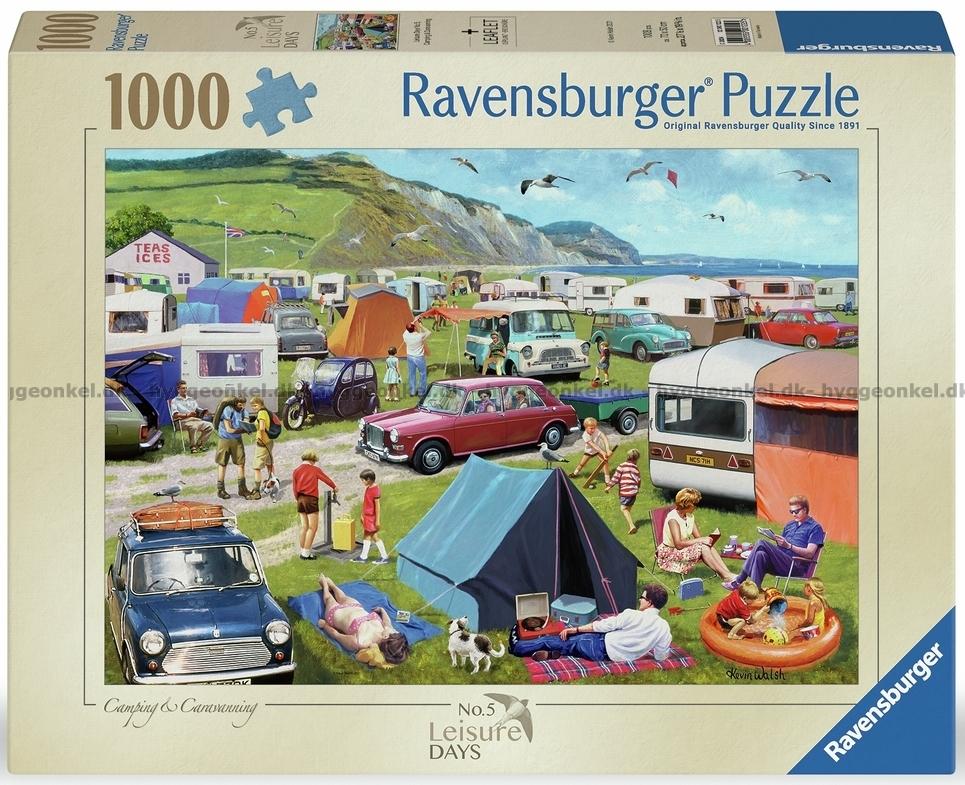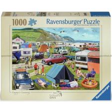 - En livlig campingplats vid kusten, där familjer njuter av en solig dag med husvagnar och tält utspridda över det gröna gräset. En kvinna ligger och solar sig på en filt, medan andra sitter och läser