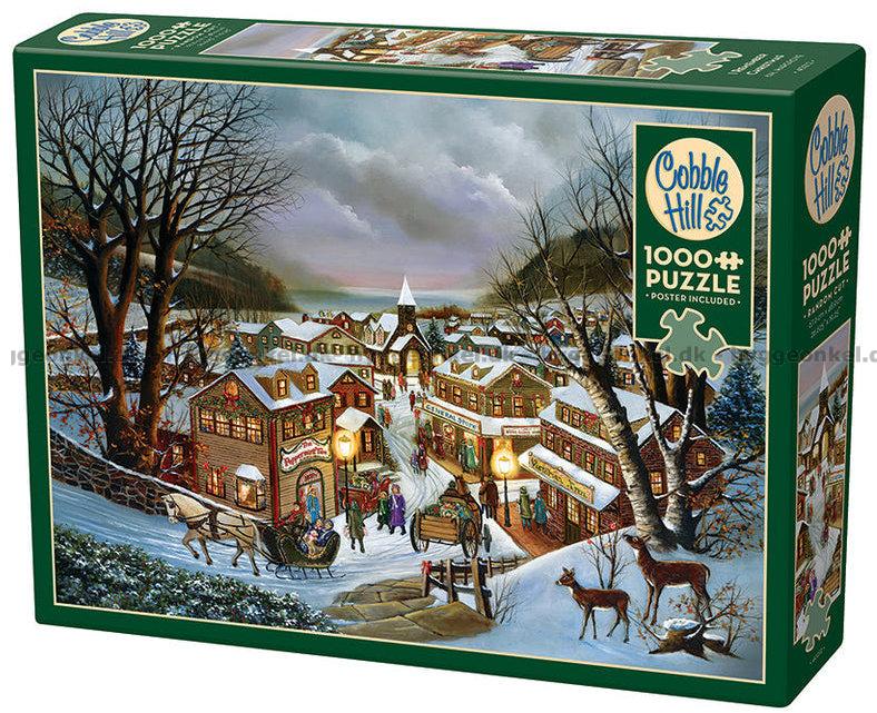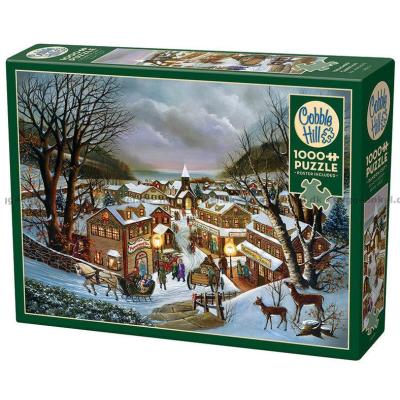 - En idyllisk by täckt av snö, där julstämningen är i full blom. Stadens gator är fyllda med människor som njuter av den festliga atmosfären. En hästdragen släde glider elegant genom snön.