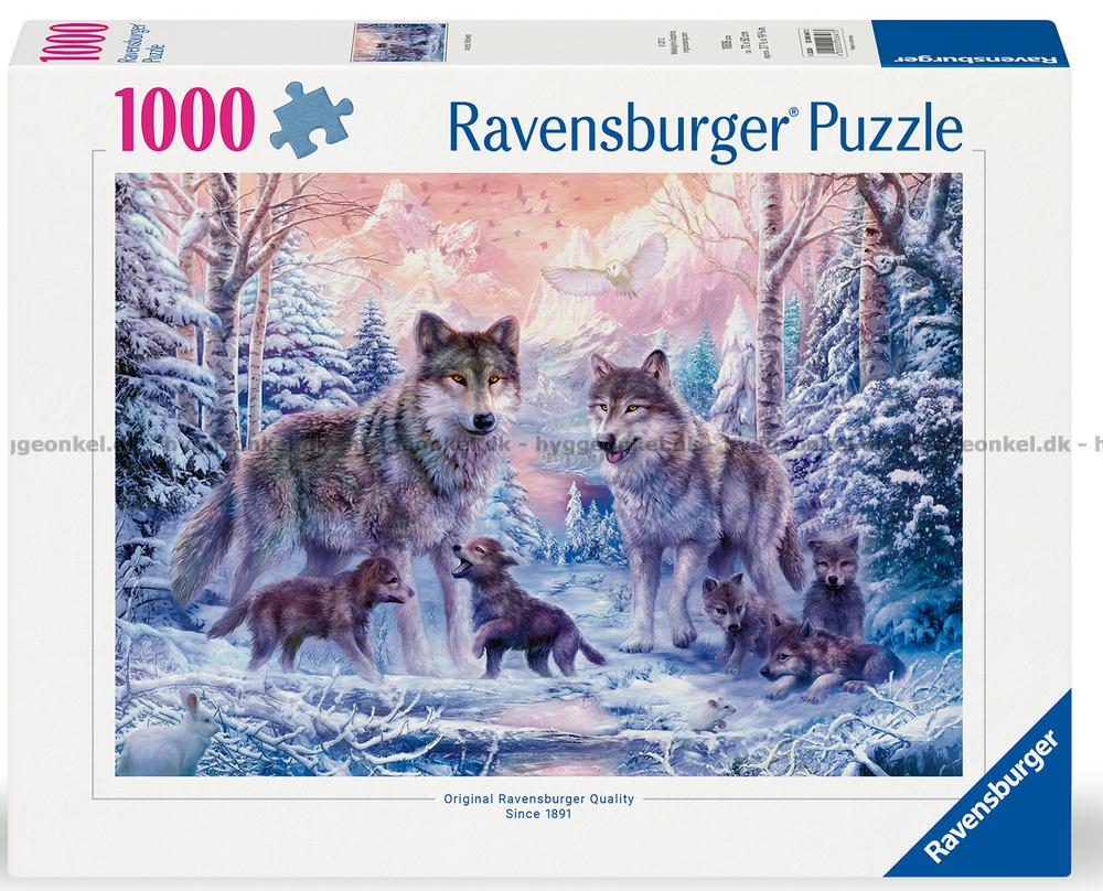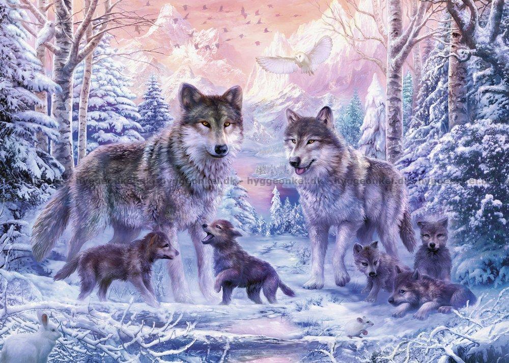- Motivet visar en grupp vargar i ett snötäckt landskap, omgivna av frostklara träd och en lugn atmosfär. Det är en scen fylld av naturens skönhet och djurliv.