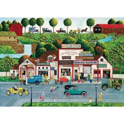 - En rostig, röd lastbil står parkerad framför bensinstationen, med en katt som vilar sig på motorhuven. Lastbilen är omgiven av gamla däck och en bensinpump med retrodesign.