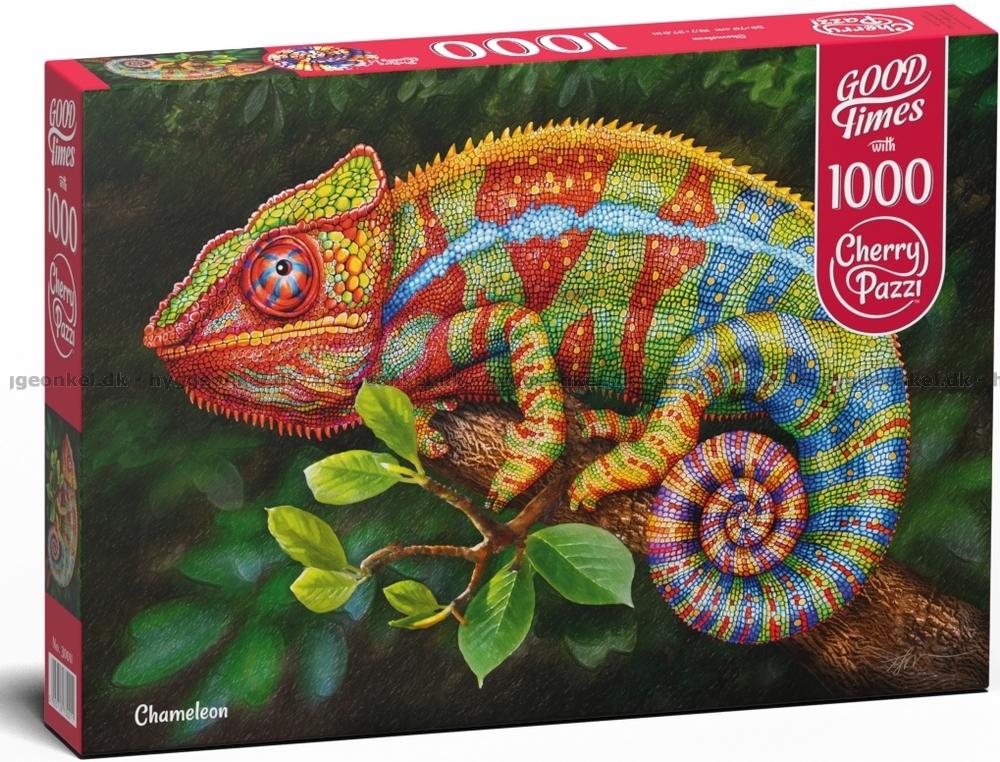 - Kameleonten lever huvudsakligen i Afrika och är känd för sin förmåga att byta färg. Motivet är ritat av Tim Jeffs