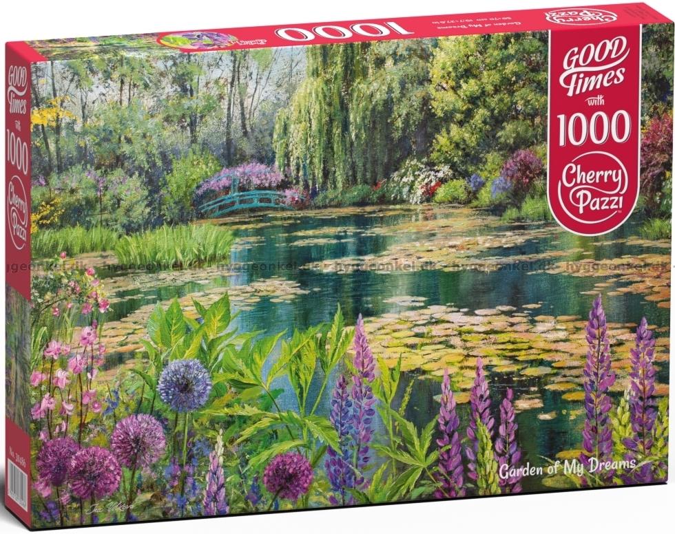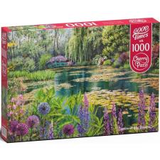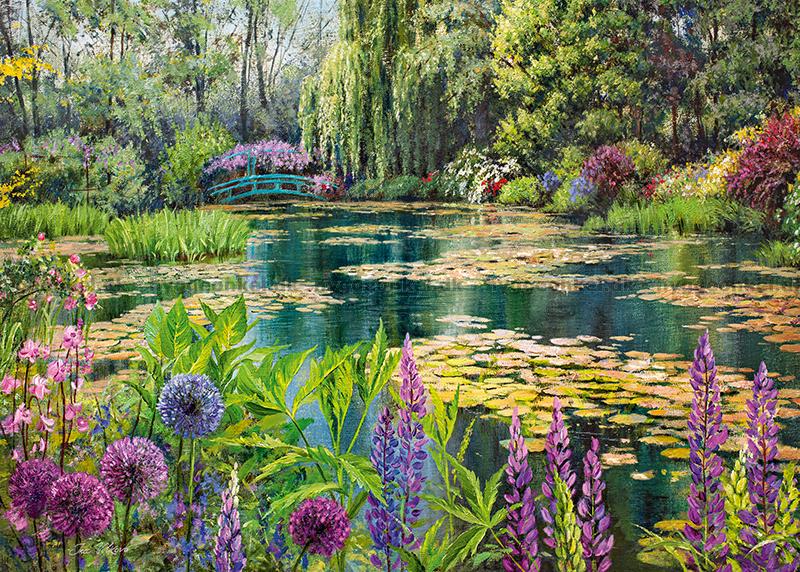 - En idyllisk trädgård med en stilla sjö omgiven av frodiga blommor och träd. Sjön är täckt av näckrosor som flyter lugnt på vattnets yta