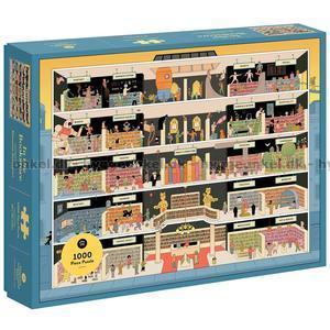 - En livlig bokhandel med flera våningar fyllda med böcker och människor. På varje våning finns olika avdelningar med böcker, och man kan se folk som bläddrar i dem