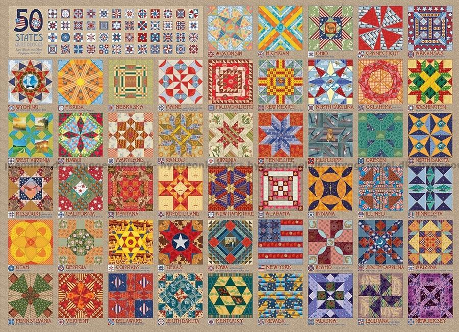 - 50 olika quiltblock, var och en representerande en amerikansk delstat. Varje block är unikt i sin design och färgval