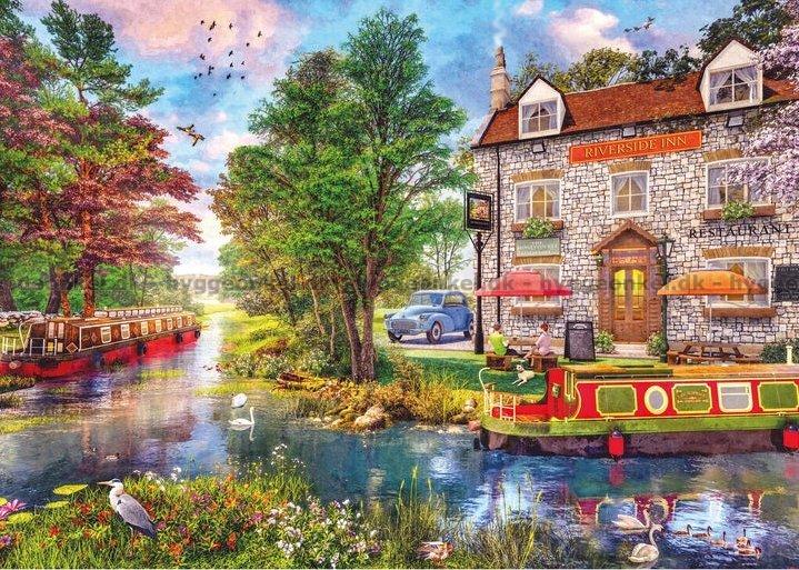 - En idyllisk krog ligger vid stranden av en stilla flod, omgiven av frodig natur och färgglada blommor. En båt ligger förtöjd vid kajen, medan en bil är parkerad framför krogen.