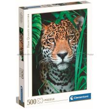 - En majestätisk jaguar stirrar intensivt ut från djungelns täta gröna blad. Dess gyllene ögon är fokuserade och skarpa, medan den observerar omgivningarna med lugn uppmärksamhet
