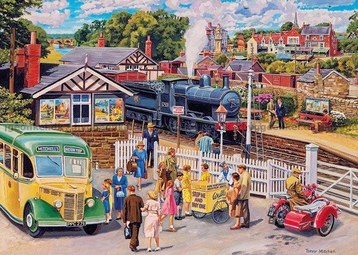 - En livlig tågstation på en solig dag, där människor har samlats för att njuta av stämningen och de olika aktiviteterna