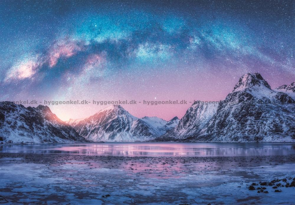 - Sjöns stilla vatten omgivet av de snötäckta bergen