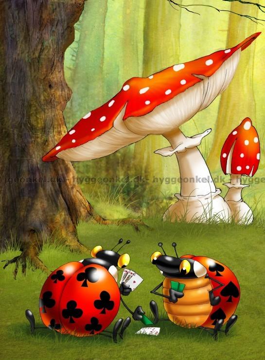 - Två nyckelpigor sitter på en grön skogsbotten och spelar kort. De verkar vara djupt koncentrerade på spelet.