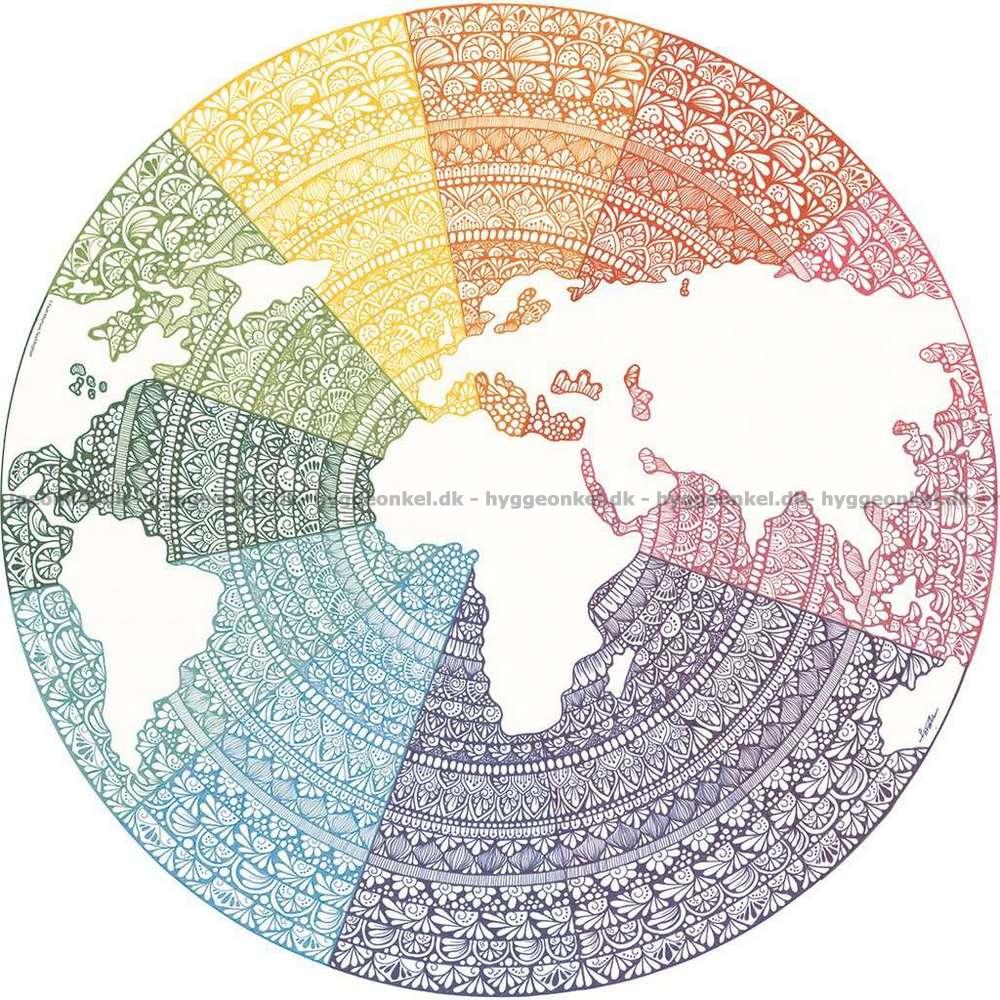 - Pusslet visar en rund form som liknar en glob. Kontinenterna är inramade av detaljerade mönster