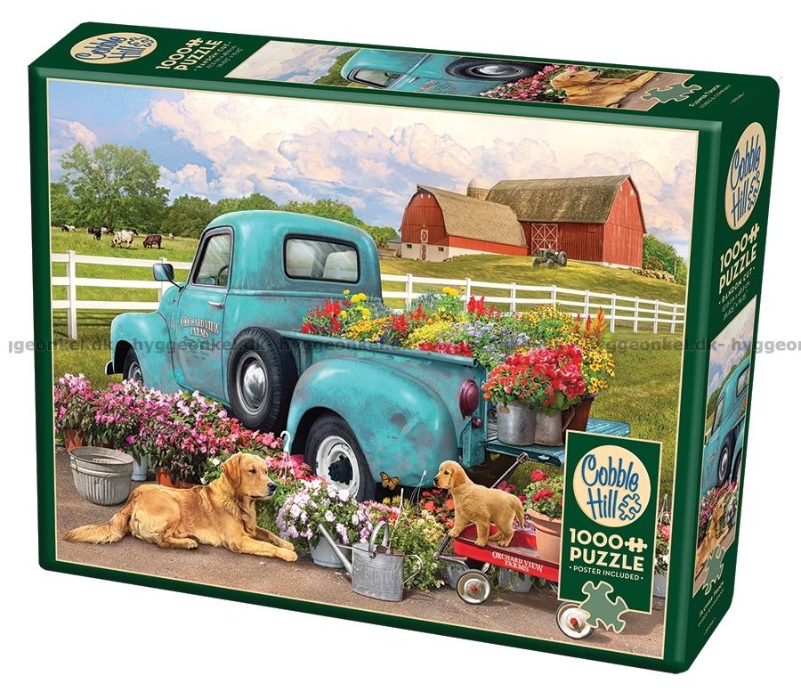 - Den gamla, turkosa lastbilen är fylld med färgglada blommor. En liten valp står i en röd vagn, redo att transporteras. Den tittar nyfiket runt