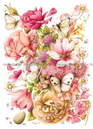 - En överdådig bukett av färgglada blommor och fjärilar. Rosor i olika nyanser av rosa och rött, som fjärilar svärmar omkring