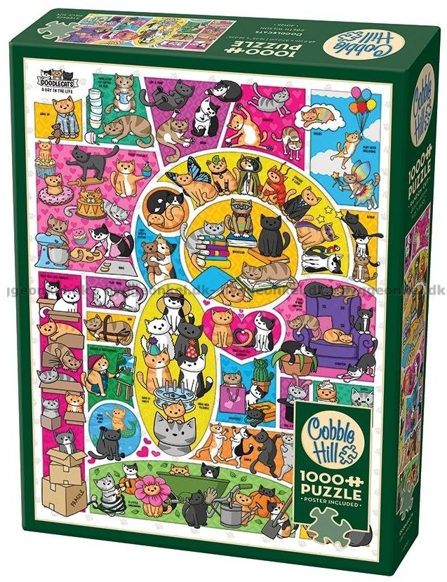 - En färgstark samling av katter i olika situationer och miljöer. Några av katterna myser med garnnystan och klättrar på hyllor