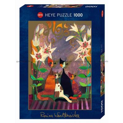 - Den vackra katten med en färgglad blomsterkrans på huvudet. Katten bär en skjorta med ett blommönster som matchar kransen på huvudet