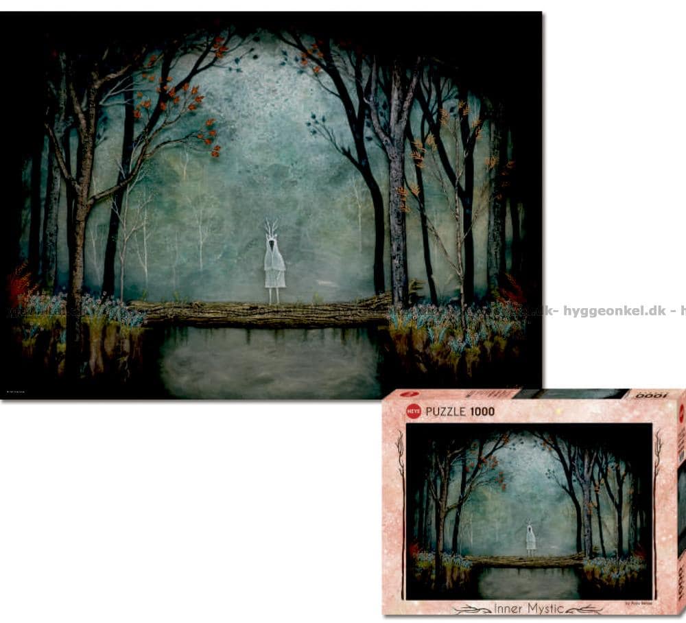 - I den mystiska skogen står en skogsande på en bro gjord av trädstammar som korsar en stilla sjö. Träden runt gestalten är höga och smala, med grenar som sträcker sig mot himlen