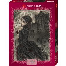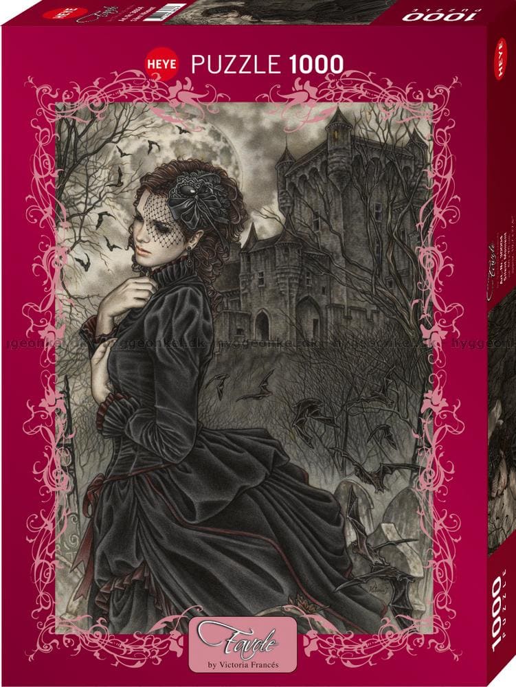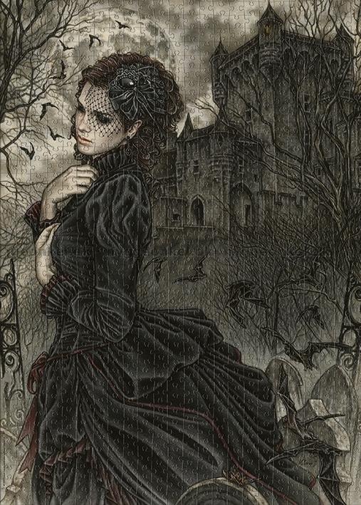 - Kvinnan i en mörk, gotisk klänning står framför slottets murar. Hon är omgiven av en stämning av mystik och tystnad, medan hon ser neråt med ett eftertänksamt uttryck.