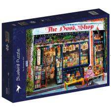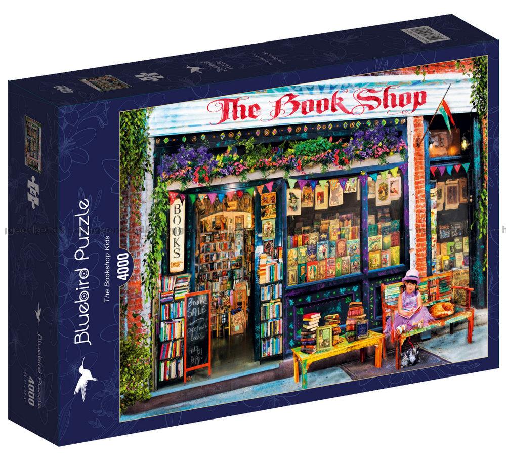 - Den färgglada bokhandeln fylld med barnböcker. En liten flicka sitter på en bänk utanför, omgiven av böcker och en katt