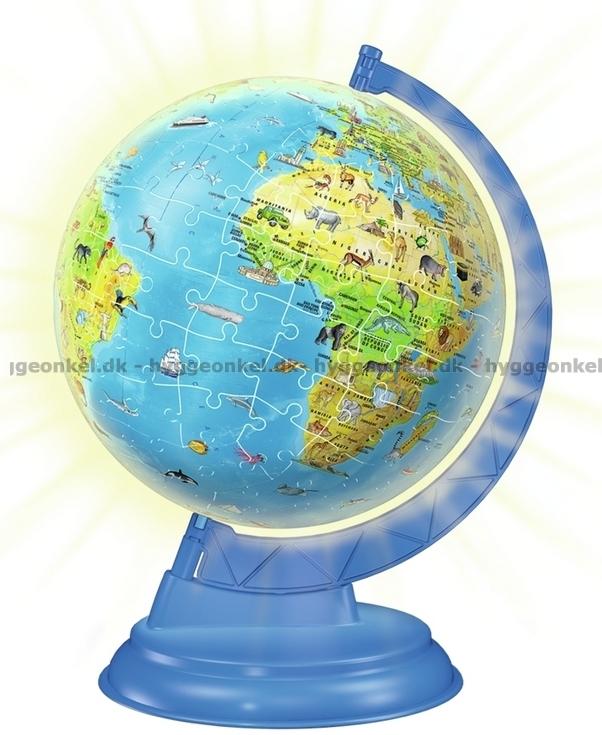 - Det är alltid spännande att titta på en glob och undersöka hur världen ser ut. Det är extra roligt när man själv har byggt denna glob. Under figurens botten kan en lampa tändas, som kan lysa i många färger.