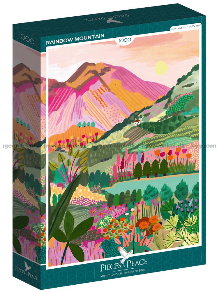 - Bergen i bakgrunden är täckta av ränder i olika färger