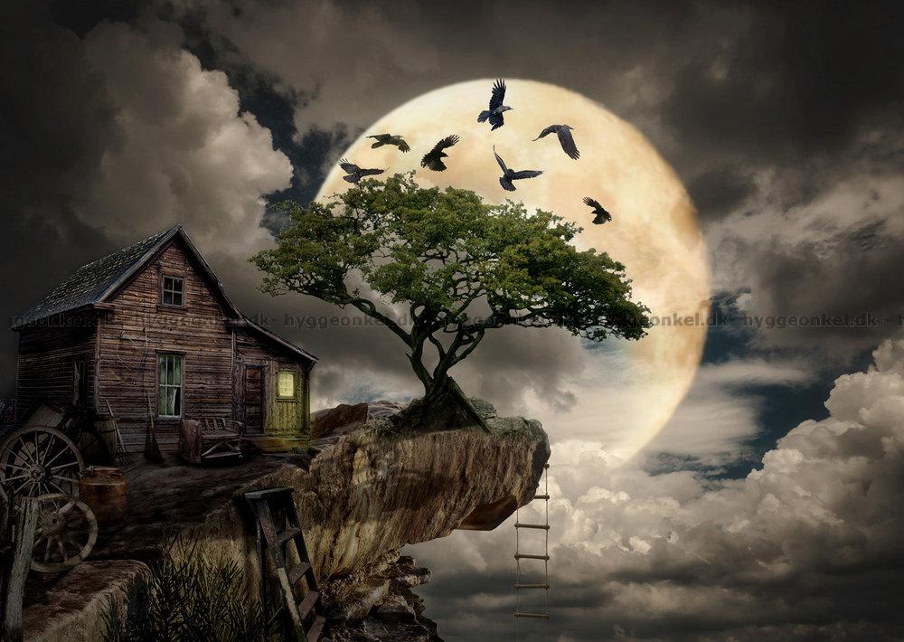 - Ett litet trähus balanserar dramatiskt på kanten av en klippa, upplyst av en stor, lysande fullmåne i bakgrunden.