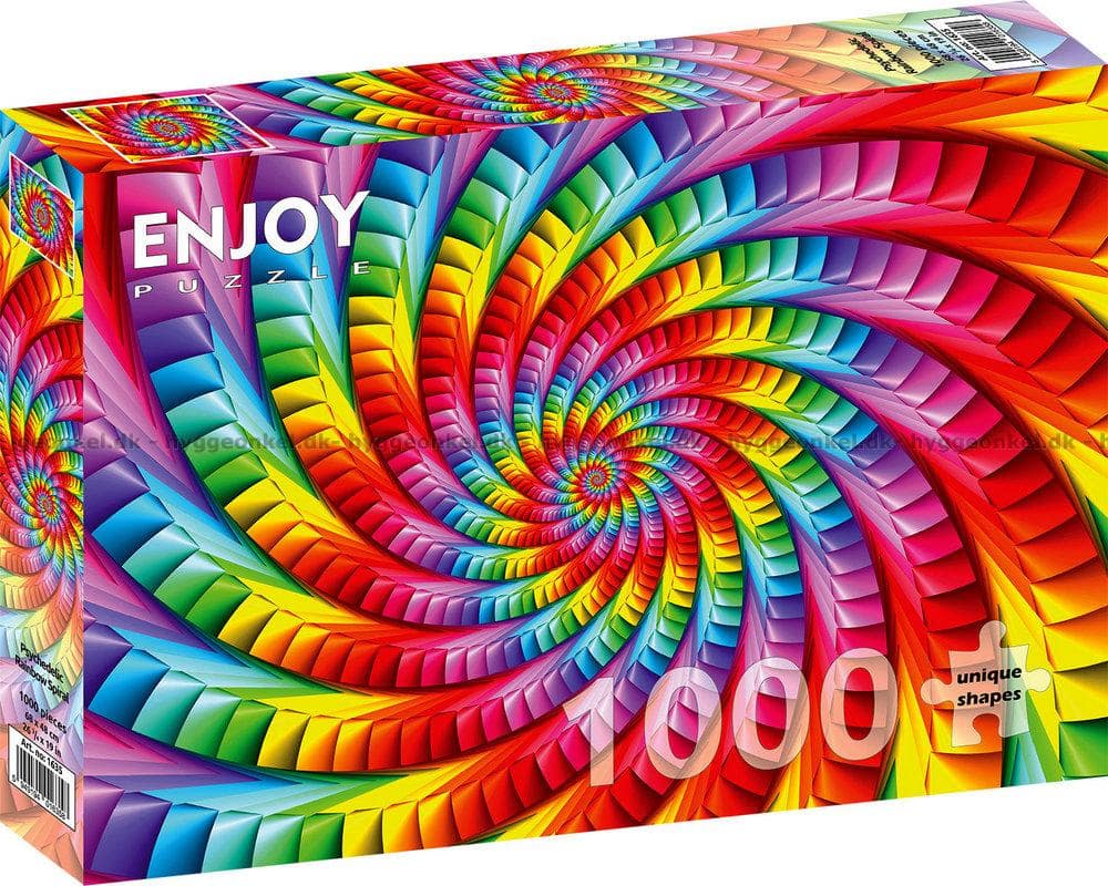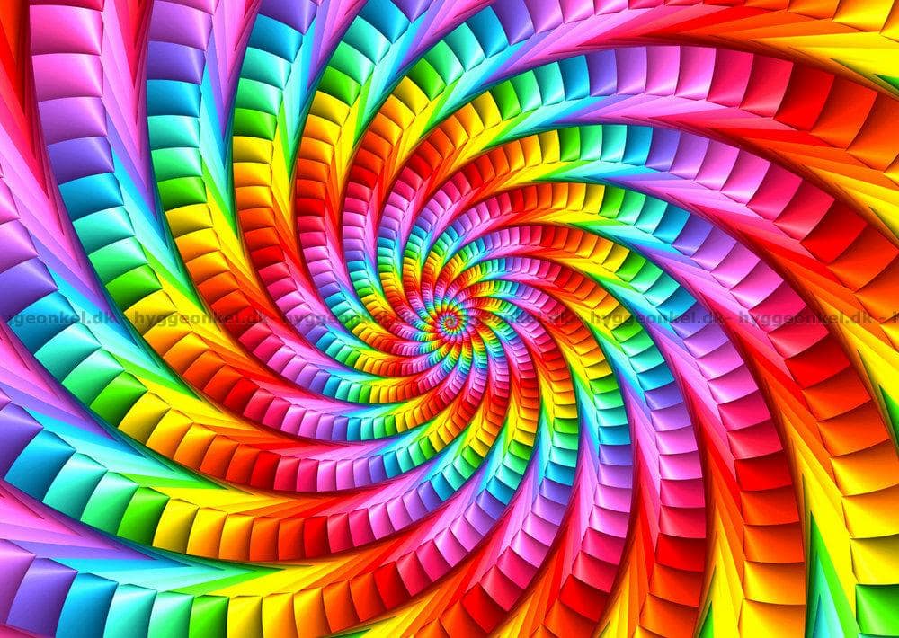 - Motivet visar en hypnotiserande spiral i regnbågens färger som slingrar sig in mot mitten. Det är en visuell fest av färger och former som skapar en dynamisk rörelse.