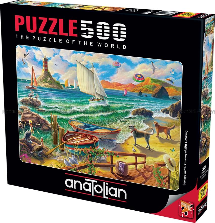 - Havet är fyllt med vågor som slår mot kusten. En stor segelbåt med vitt segel skär genom vattnet