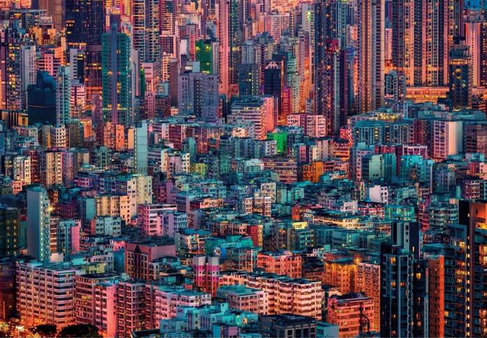 - Höghusen lyser i vackra färger i denna tätbefolkade storstad