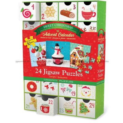 - Öppna en ny lucka varje dag – 24 luckor totalt. Varje motiv består av 50 bitar – totalt 1200 bitar. Det handlar om 24 små pussel – de kan inte sättas ihop till ett stort