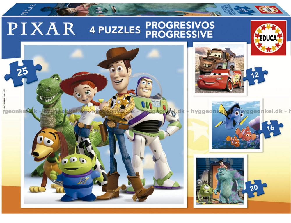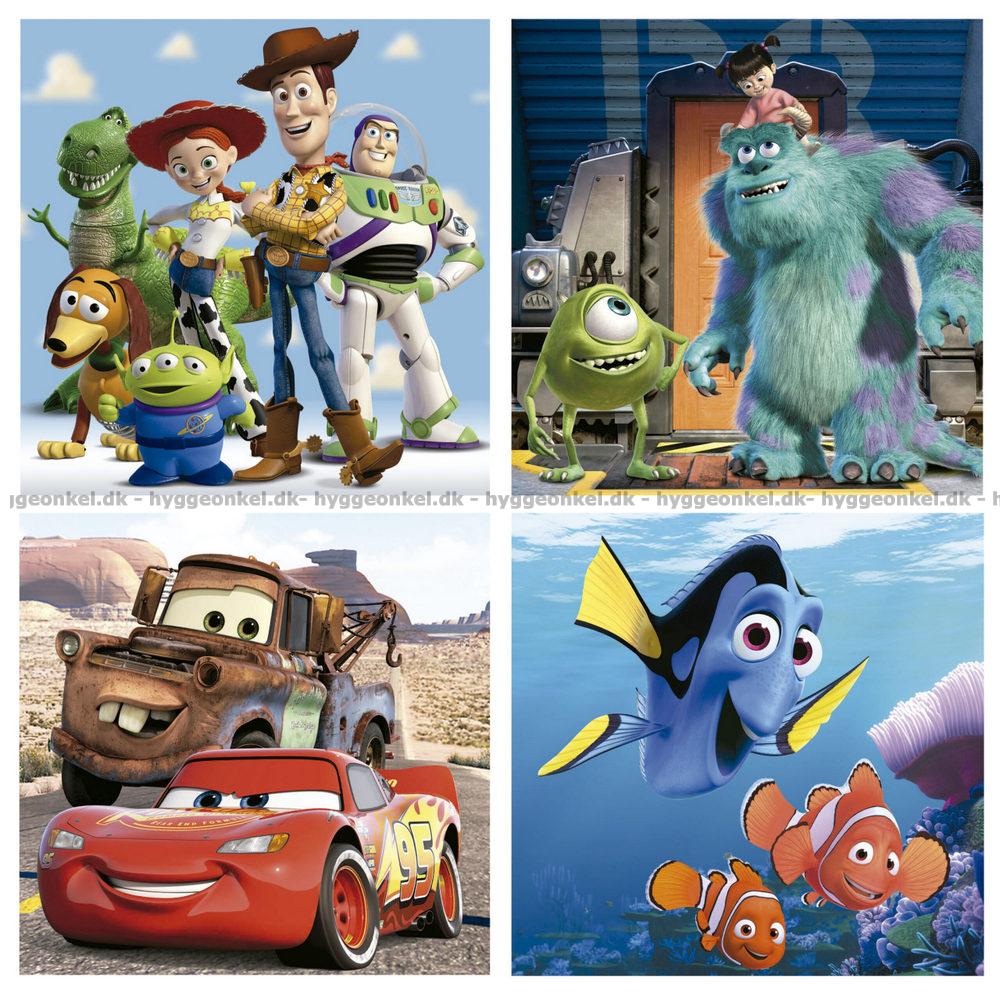 - 4 motiv från tecknade filmerna Toy Story, Bilar, Hitta Nemo och Monsters Inc. Pusslen har 12, 16, 20 och 25 bitar