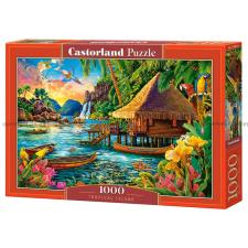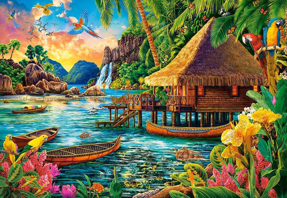 - Stugan ligger på pålar i vattnet i detta tropiska paradis