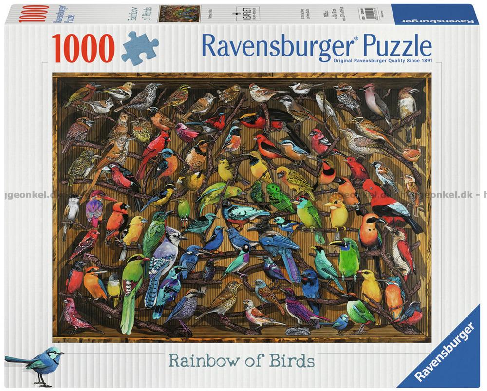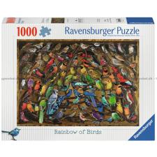 - En collage av fina fåglar i olika färger, placerade så att de bildar en regnbåge