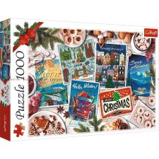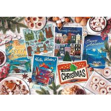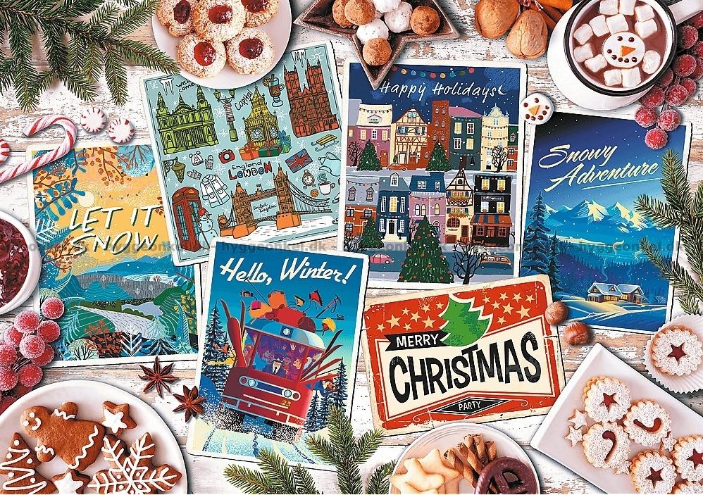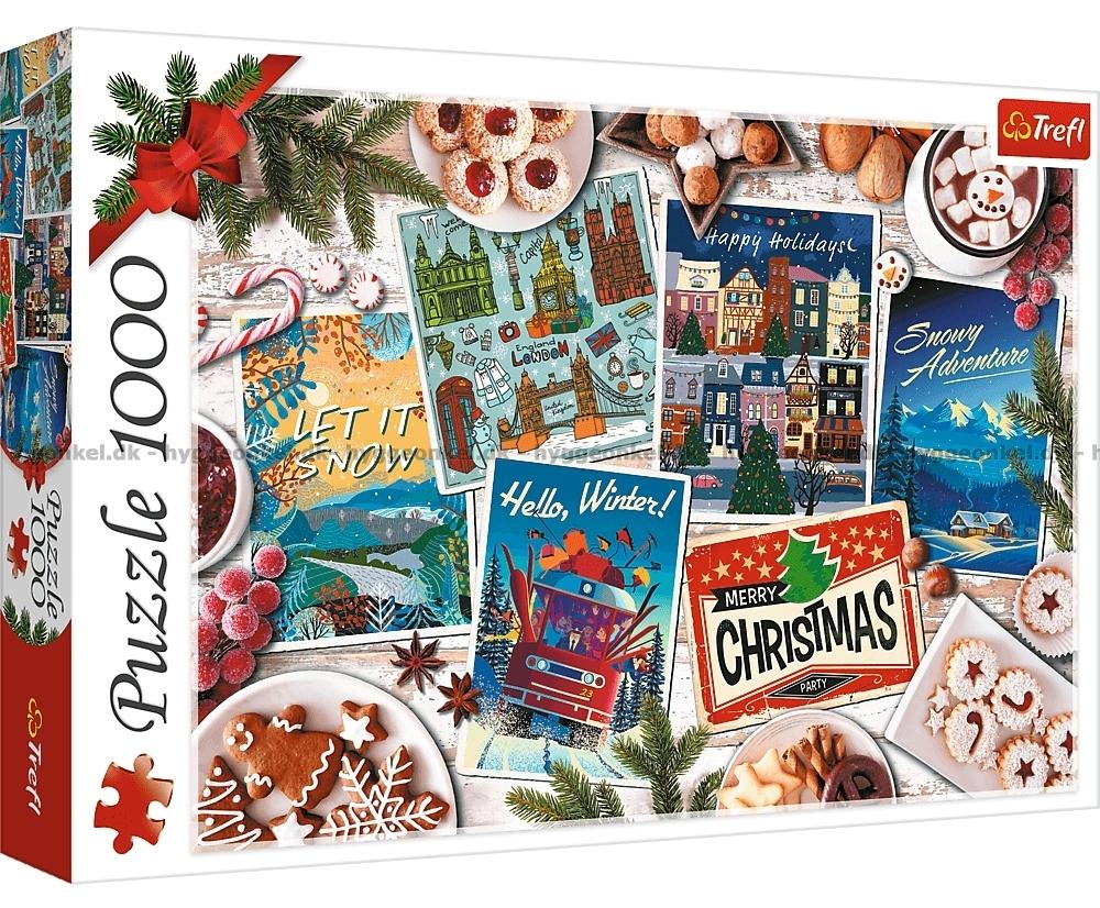- Mysig vinter- och julcollage med vykort och ätbara frestelser