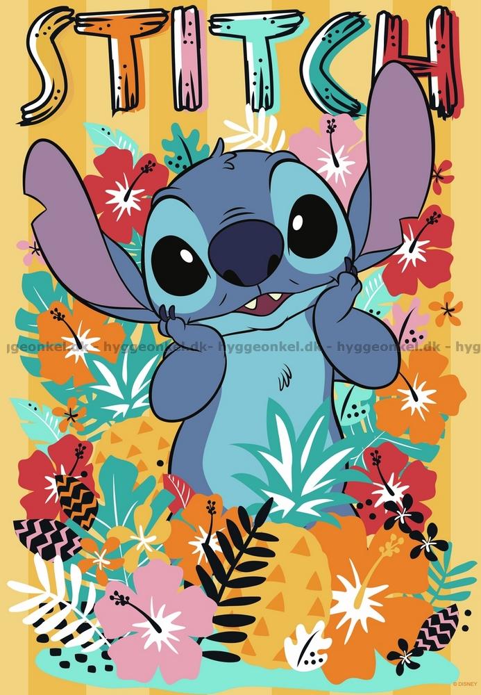 - Vackert porträtt av Stitch med fina blommor i bakgrunden