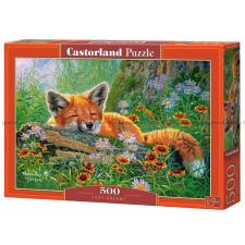 - Den lilla rävungen har somnat mot trädstammen bland blommorna