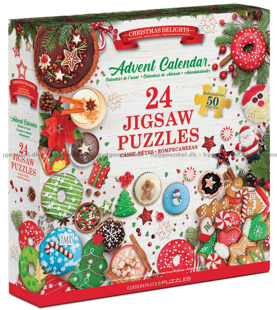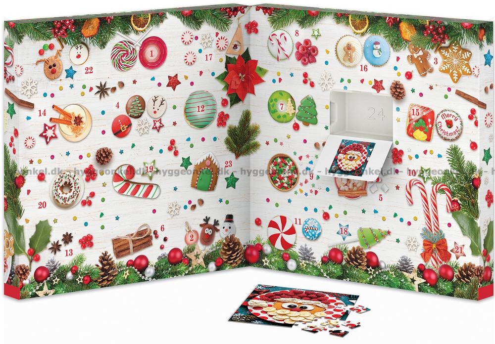 - Bakom varje lucka i denna kalender döljer sig ett litet pussel med mysiga och färgglada julkakor och andra godsaker