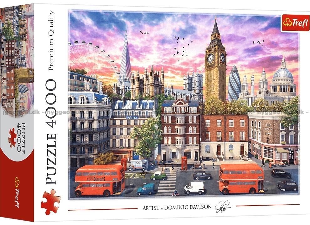 - En spännande vy över London med de ikoniska röda dubbeldäckarbussarna i förgrunden och den vackra himlen i bakgrunden
