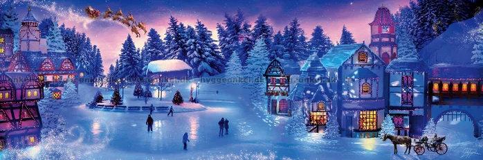 - Staden ligger inbäddad i snö och is. Över himlen kommer jultomten i sin släde