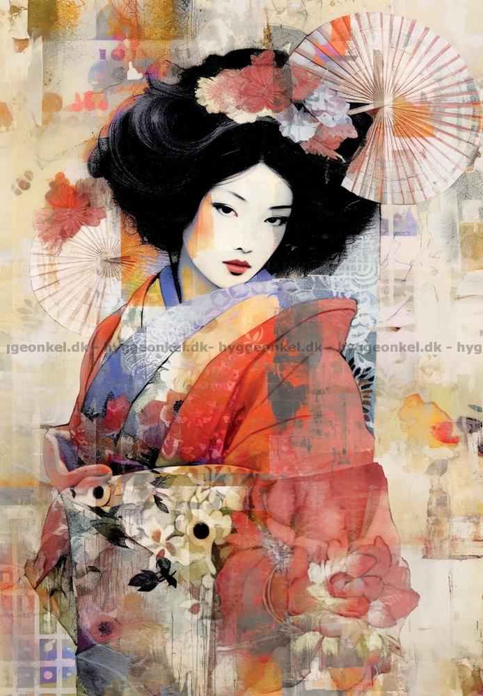 - Denna geisha är klädd i en kimono och har en solfjäder i håret