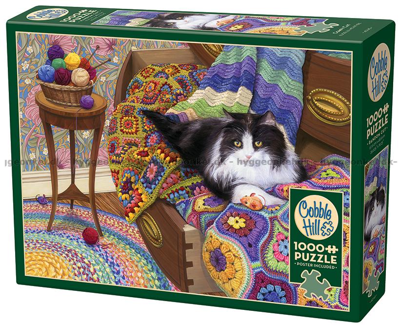 - Katten slappnar av på de mjuka virkade filtarna